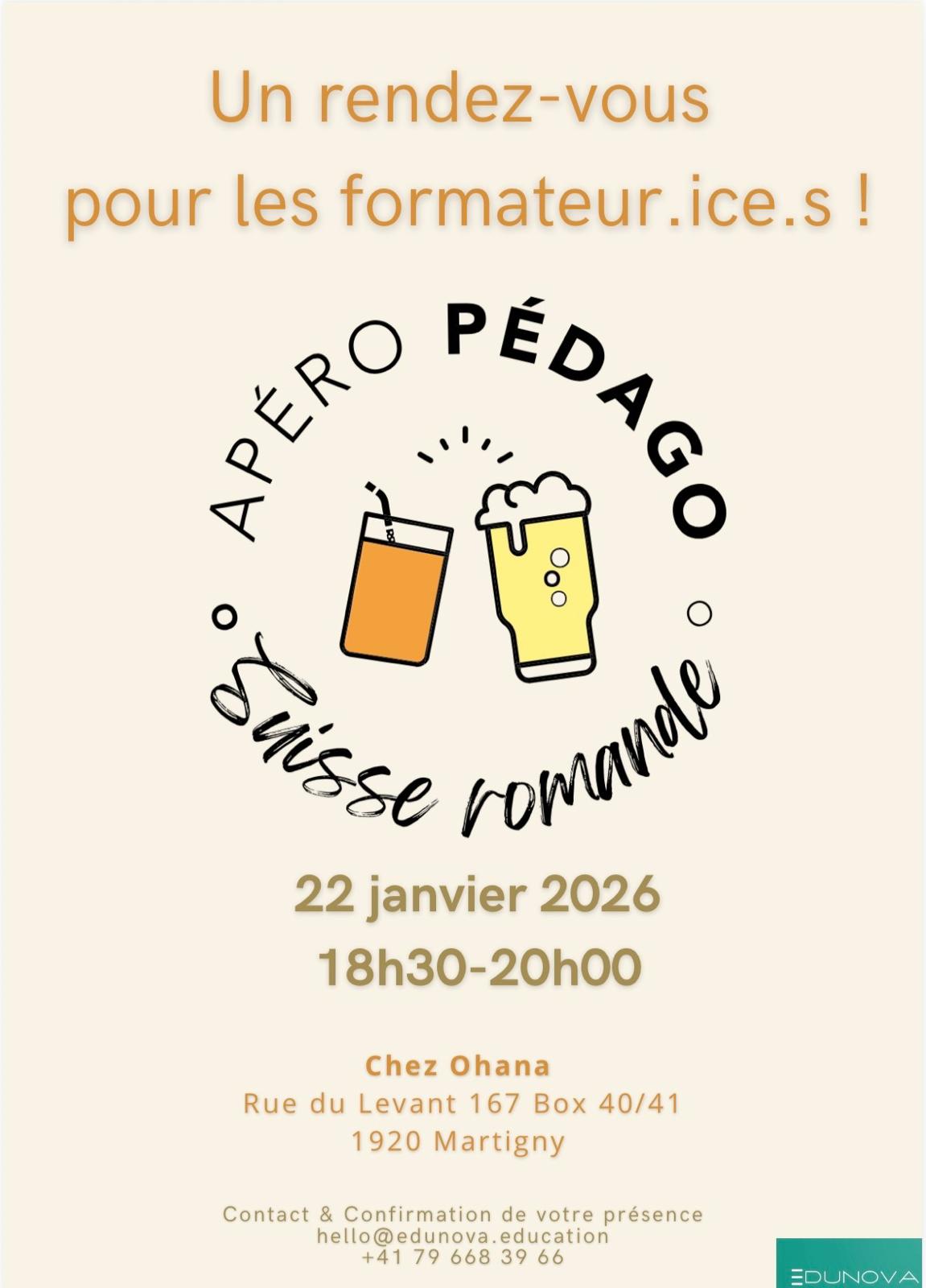 Autour d’un verre et dans une ambiance décontractée, nous échangeons nos expériences, nos réussites et nos doutes pour imaginer ensemble de nouvelles façons d’apprendre et d’enseigner. Inspirés du format des ApéroPédago en France, ces ateliers trouvent ici une touche romande et s’ancrent dans le champ de la formation continue et professionnelle.